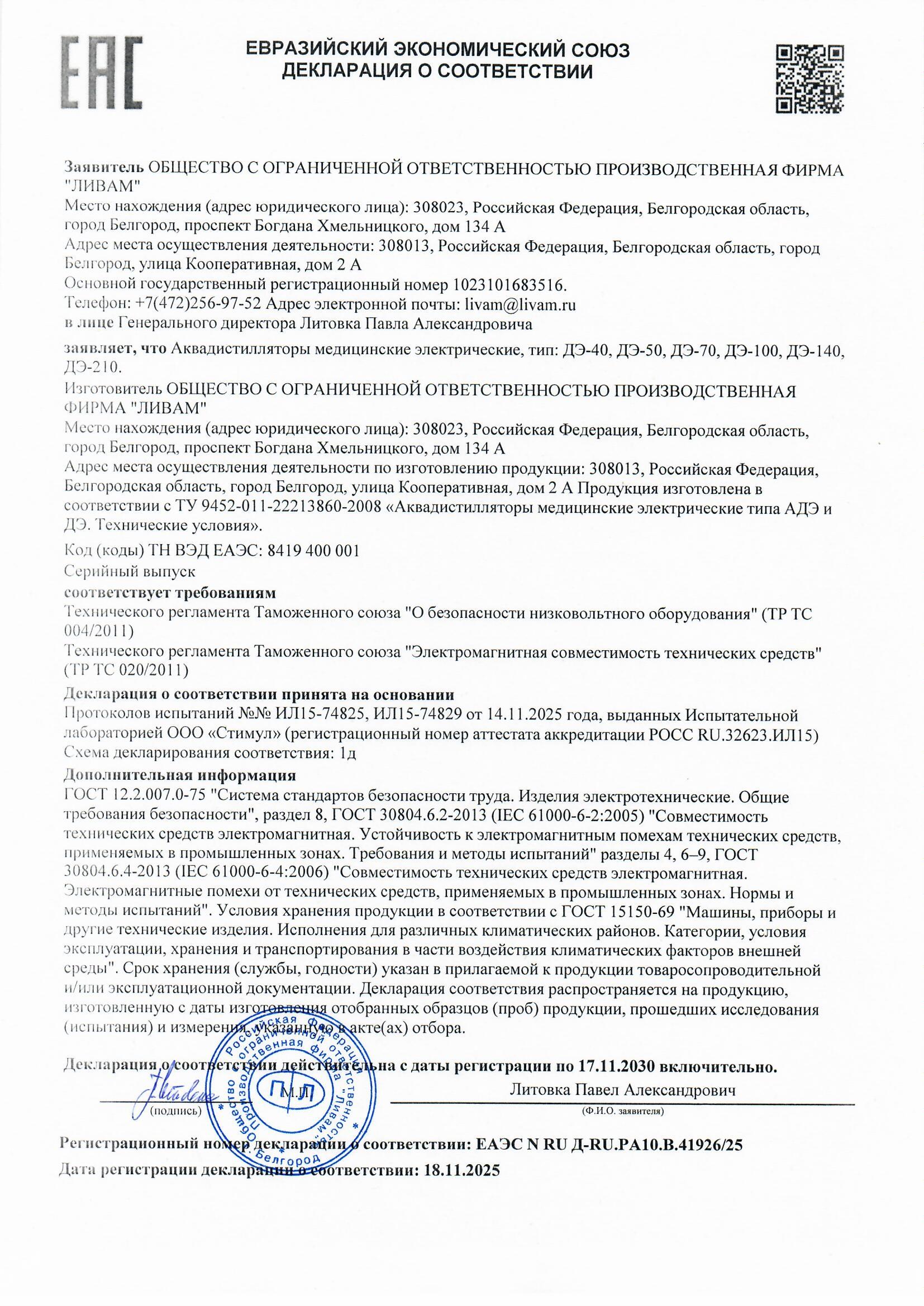 Особенностью дистилляторов ДЭ-100 является использование электродов в качестве нагревающих элементов. Аквадистиллятор электрический ДЭ-100 идеально подходит для предприятий, лабораторий, медицинских учреждений, с жёсткой водой. Дистиллятор менее чувствителен к качеству исходной воды и количеству избыточных отложений на нагревающих элементах. ДЭ-100 позволяет получать дистиллированную воду, соответствующую ГОСТ без применения дорогостоящих фильтров, смол, и специальных мембран.