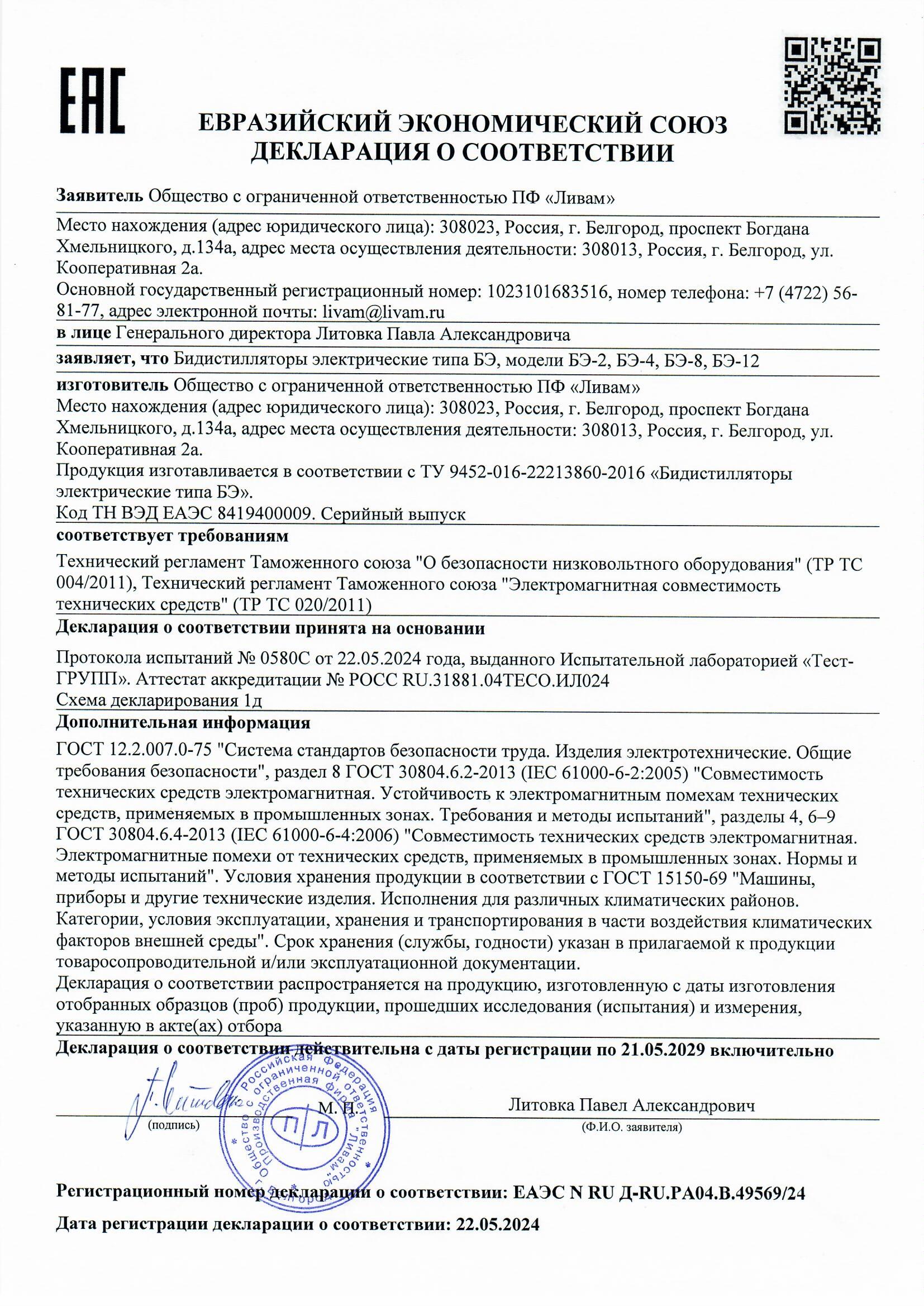Преимуществом БЭ-4 является уникальная конструкция, позволяющая добавлять реагенты в камеру испарения 2-й ступени бидистиллятора для осуществления вторичной перегонки воды непосредственно с реагентами. Бидистиллятор БЭ-4 идеально подходит для предприятий, научных центров и лабораторий, где требуется вода аналитического качества и вода для лабораторного анализа. На сегодняшний день только двойная дистилляция позволяет получать воду 2 типа для лабораторного анализа, без применения дорогостоящих фильтров, смол, и специальных мембран.